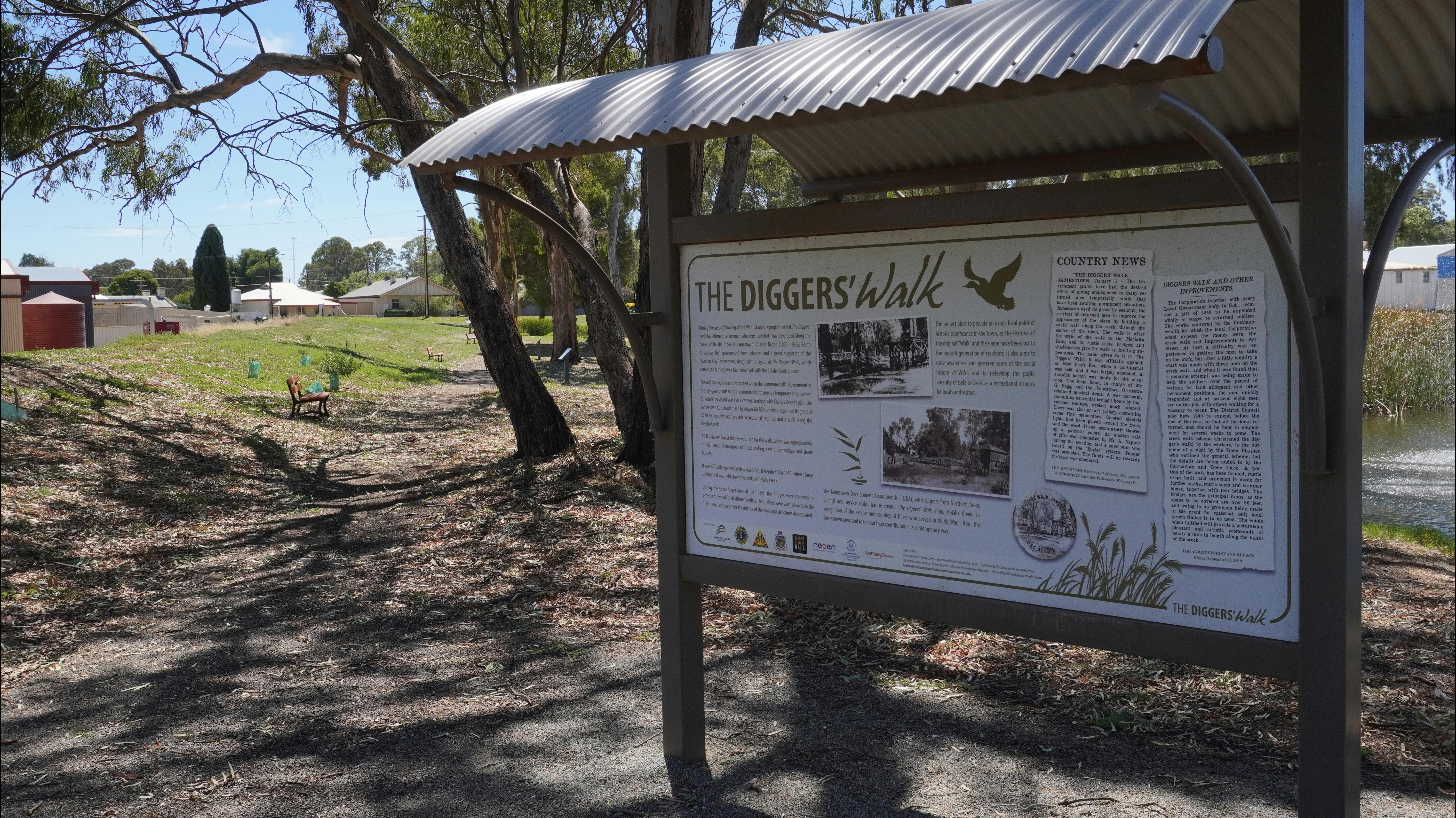 Set alongside the gum tree–lined Belalie Creek that winds through the heart of Jamestown, Digger’s Walk is a peaceful heritage trail with deep historical roots. Originally created as a project for returned servicemen after World War I, the walk was built by local veterans who planted trees and constructed rustic bridges, paths, and small shelters along the creek.
